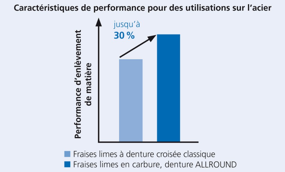 - Performance d’enlèvement de matière nettement plus élevée qu’avec des fraises limes à denture croisée.