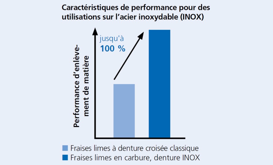 De plus, la denture INOX se distingue avec une performance de coupe 100 % plus élevée lorsqu'elle est utilisée sur l'acier inoxydable par rapport aux fraises limes à denture croisée classique.