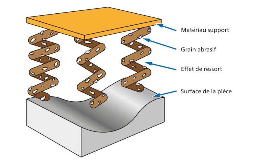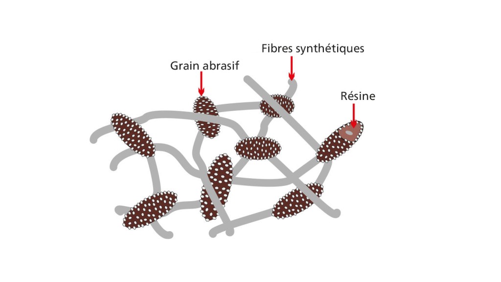 Le non-tissé abrasif est une structure tridimensionnelle composée de fibres de polyamide, de résines synthétiques et de grains abrasifs. Les fibres non tissées sont imprégnées de résine et garnies de grains abrasifs. La répartition homogène des grains abrasifs dans l’enchevêtrement de fibres garantit une libération continue de nouveaux grains tranchants pendant l’usinage.