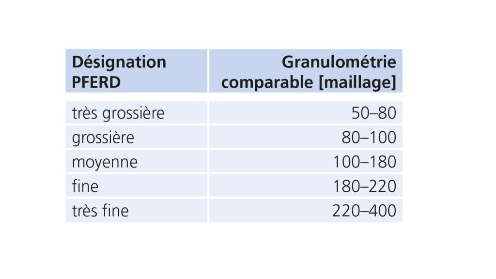 Pour les abrasifs à liant classiques ou les abrasifs appliqués, l’utilisateur choisit une granulométrie spécifique. Pour le non-tissé abrasif, la désignation suit le schéma suivant :