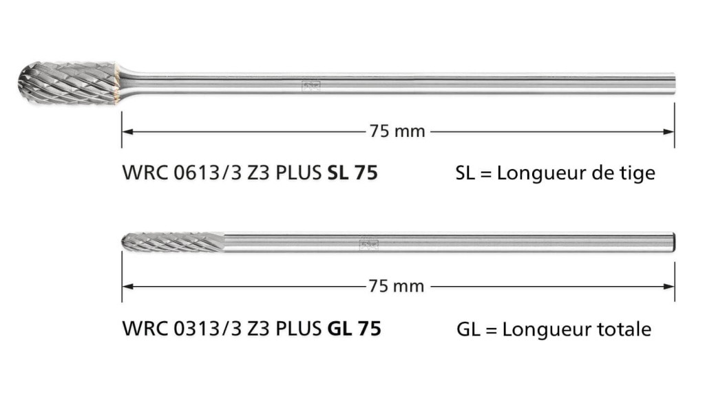 GL désigne la longueur totale d’une fraise sur tige en carbure monobloc. SL fait référence à la longueur de la tige d’une fraise en carbure avec une tige longue en acier.