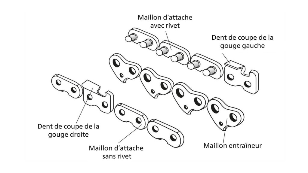 Une chaîne de tronçonneuse se compose de maillons de coupe, de maillons entraîneurs et de maillons de liaison.