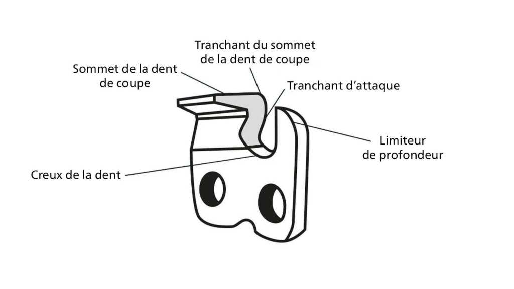 Le limiteur de profondeur se trouve, quant à lui, devant la dent de coupe et a pour fonction de limiter la profondeur de pénétration dans le bois.